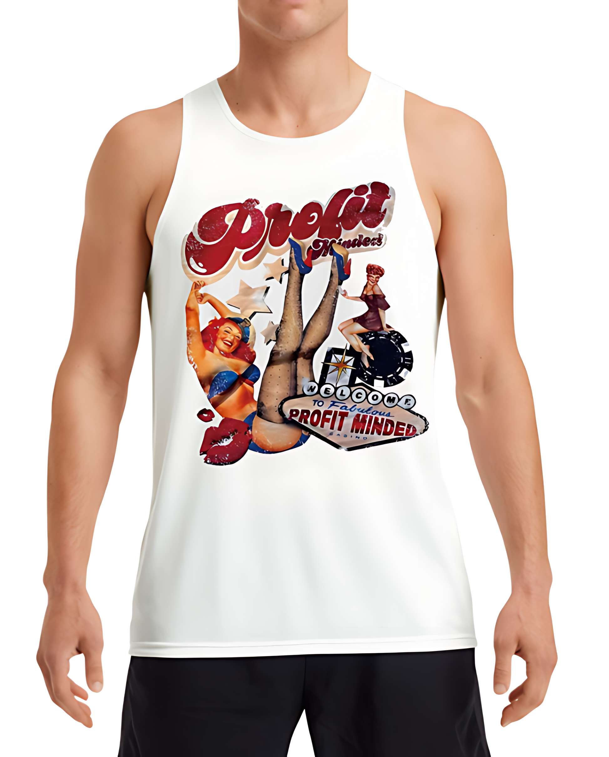 Turn heads with the Men’s “Profit Minded” Graphic Tank Top, a bold sleeveless piece inspired by retro Vegas glamour. Featuring vintage-style pin-up artwork, casino graphics, and vibrant text, this top embodies a playful and confident streetwear-meets-retro aesthetic.