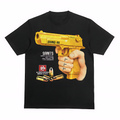 Make a fearless statement with the Saints Brand 88 Golden Gun Graphic Tee. This black t-shirt features a bold front print of a golden pistol with detailed bullet graphics and strong typography, embodying urban edge and modern streetwear culture. Perfect for those who love daring, standout designs.