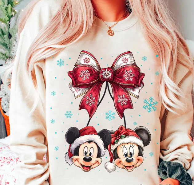 Celebrate the magic of the season in style with the Cute Christmas Bow Sweatshirt, featuring a charming design of two festive mouse characters wearing Santa hats, hanging from a beautifully detailed red Christmas bow. Surrounded by snowflakes, this sweatshirt perfectly captures the joy, warmth, and whimsy of the holidays, making it a must-have for anyone who loves cute and cozy Christmas fashion.
