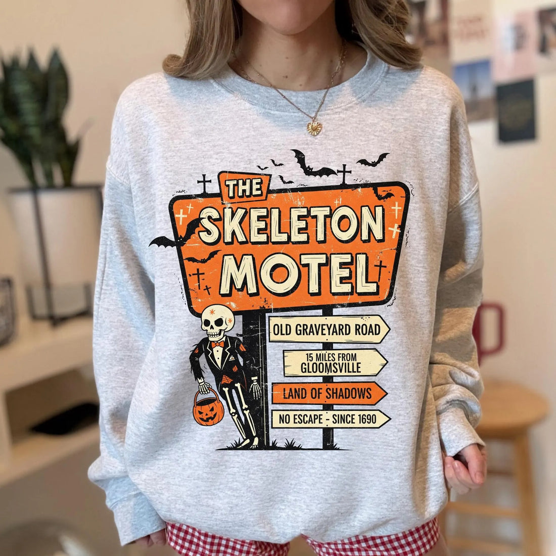 Skeleton Motel Halloween Sweatshirt – Vintage Spooky Graphic Pullover