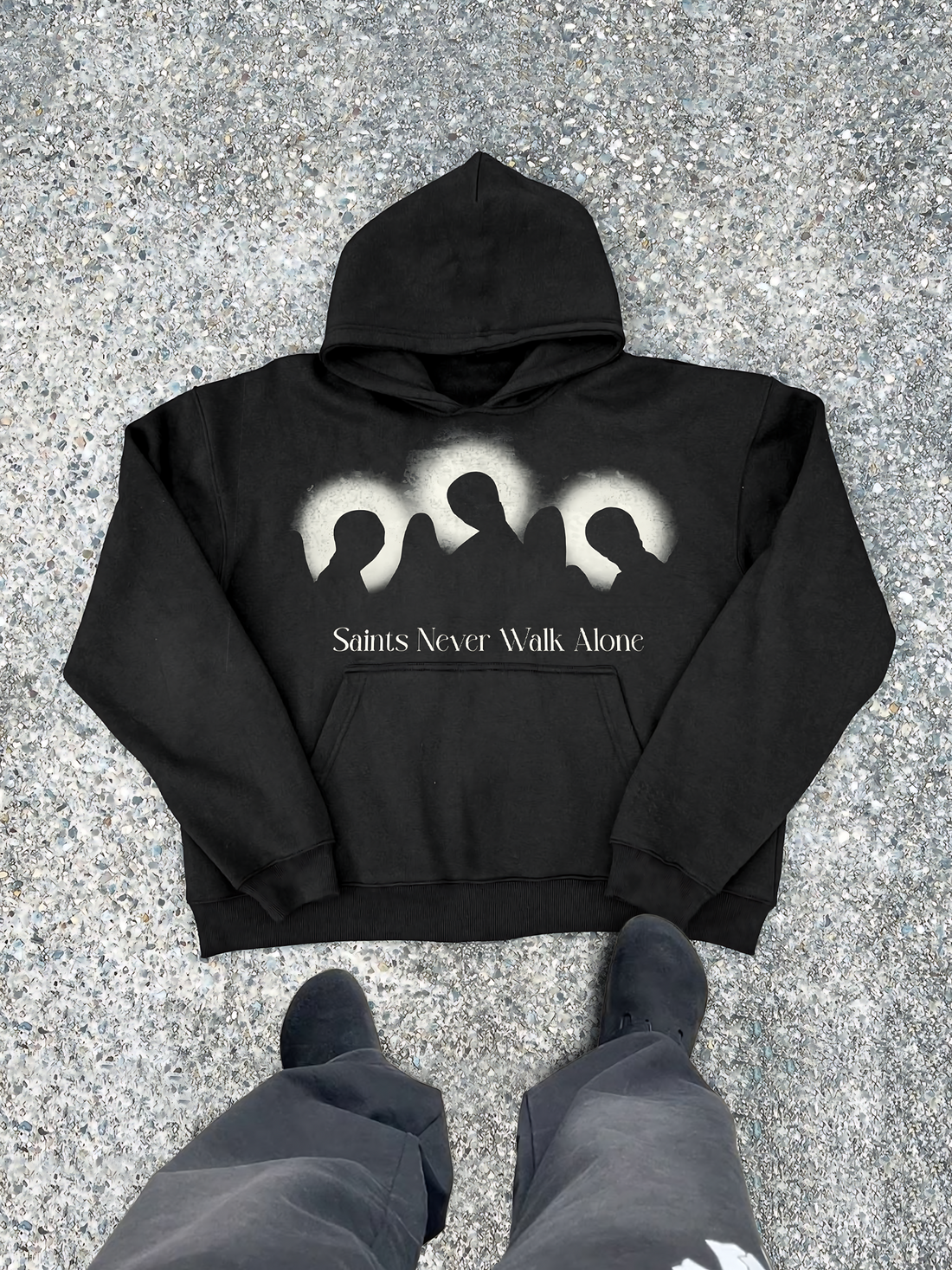 Saints Never Walk Alone Abstract Graphic Hoodie – Vintage Streetwear Black Unisex Pullover