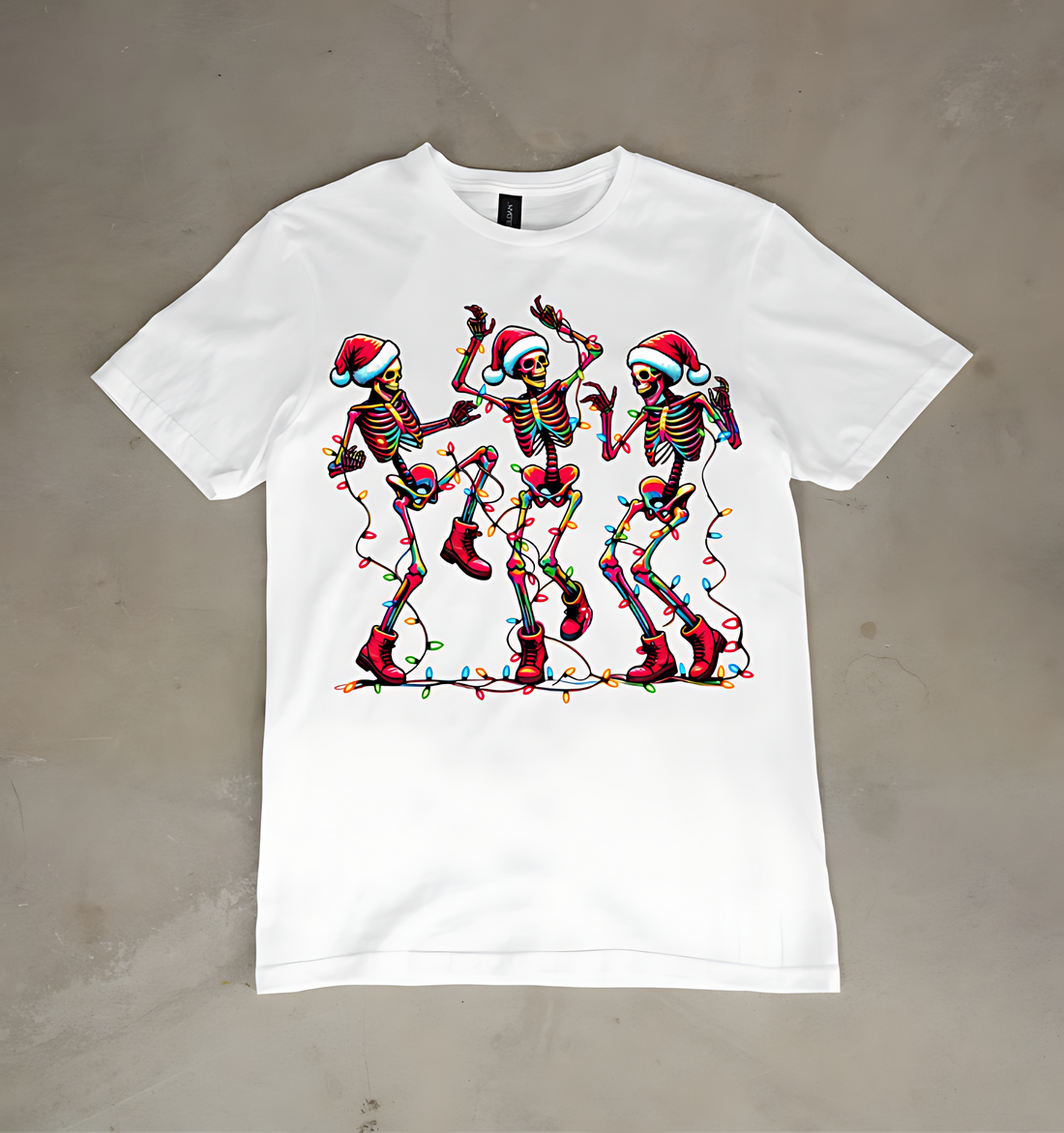 Get into the spooky holiday spirit with our Dancing Skeleton Christmas T-Shirt! Featuring three festive...