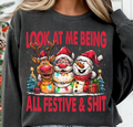 🔹 Print: Vibrant “Look at Me Being All Festive” graphic with Santa, snowman, and reindeer.