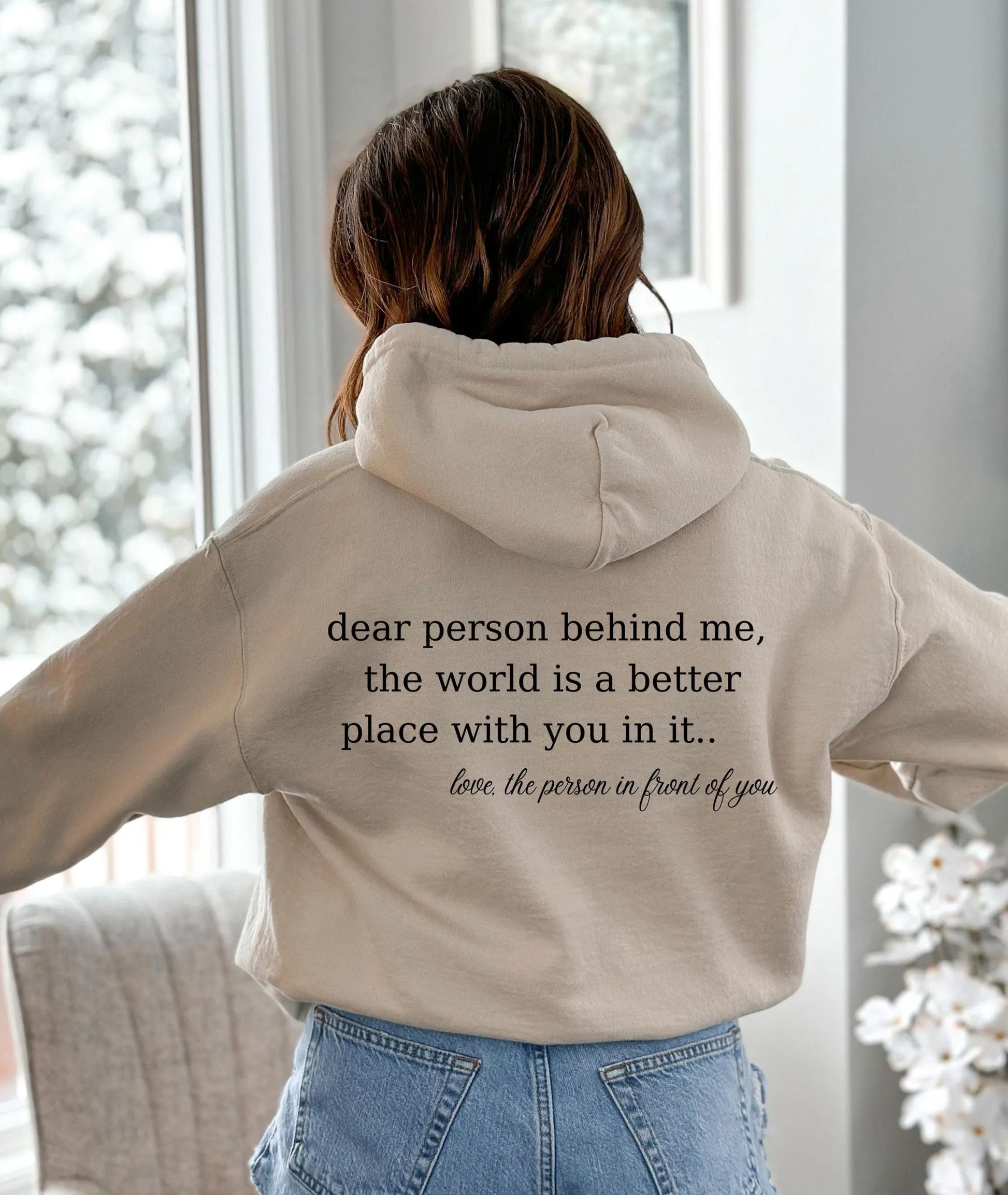 Spread positivity and self-love with the "You Are Enough" Hoodie – a minimalist design with a powerful message. The front features the uplifting quote “you are enough”, while the back carries a heartwarming reminder: “Dear person behind me, the world is a better place with you in it. Love, the person in front of you.”