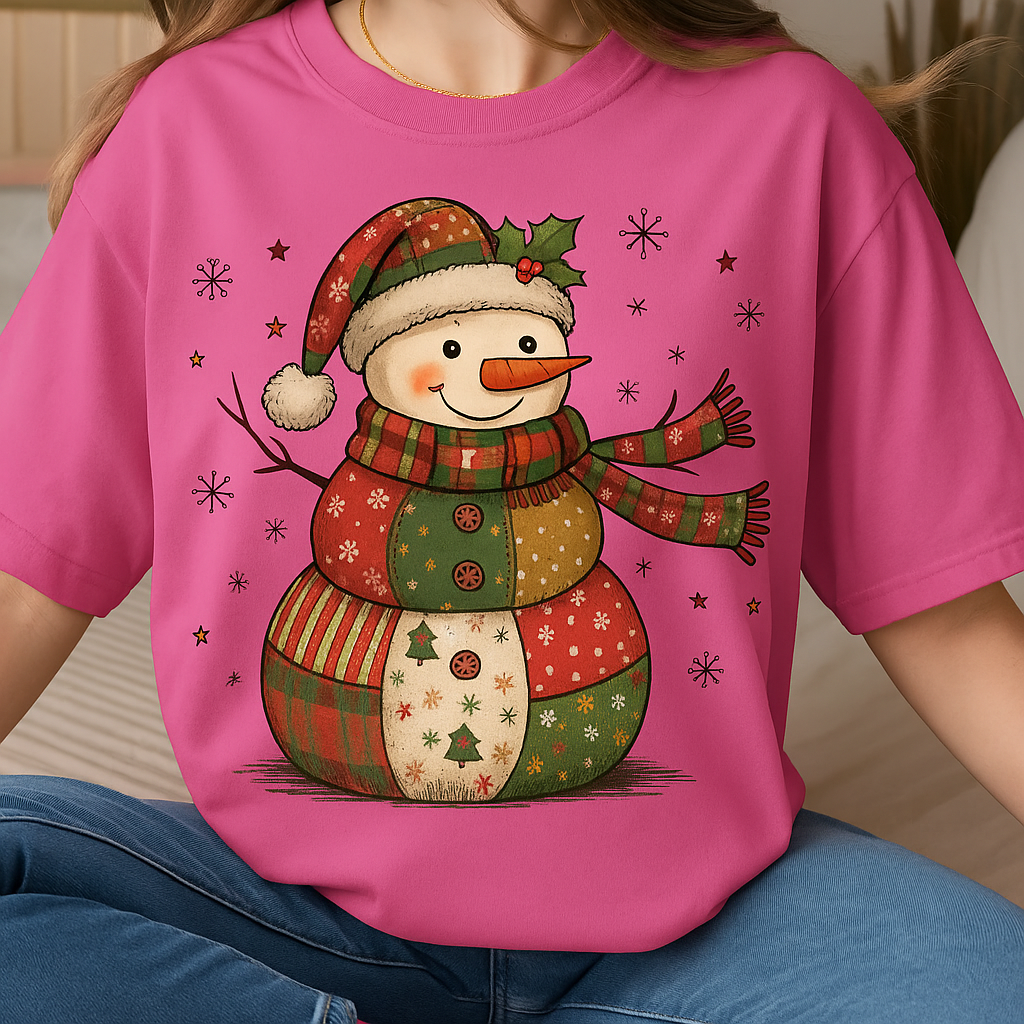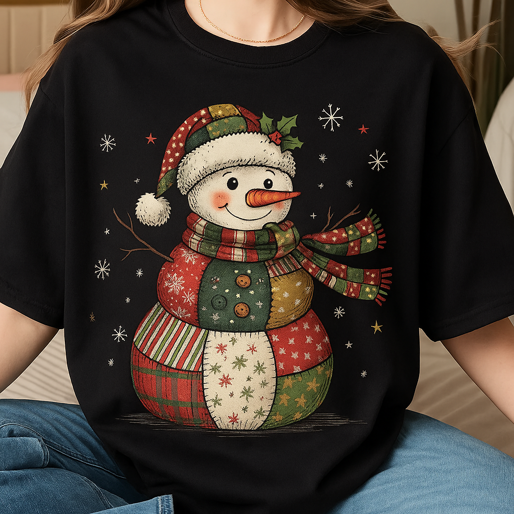 ☃️ Charming Design: Cute patchwork-style snowman illustration with festive Christmas colors and details.