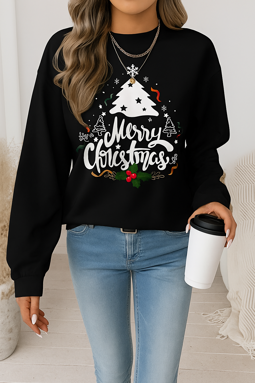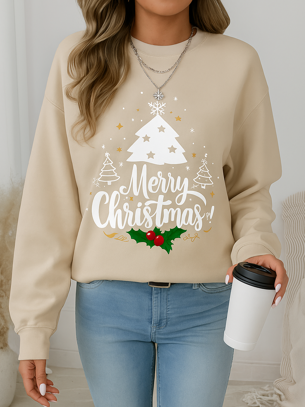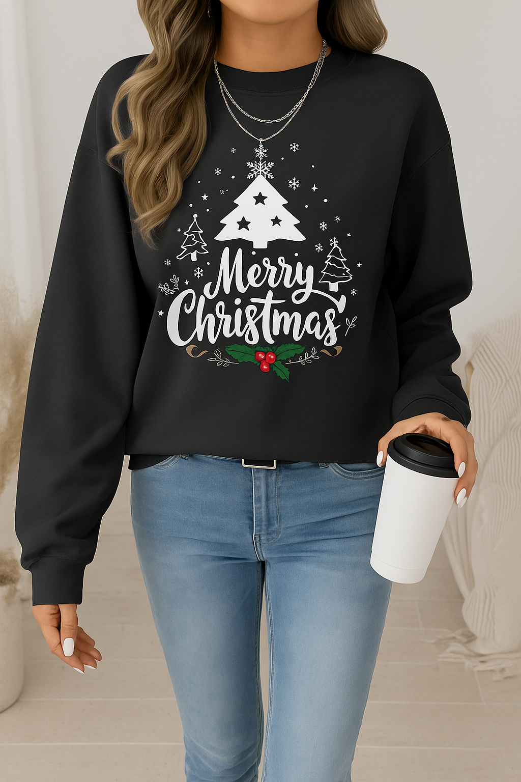 🎄 Festive Holiday Design: Stylish “Merry Christmas” print with a white tree, snowflakes, and holly details.