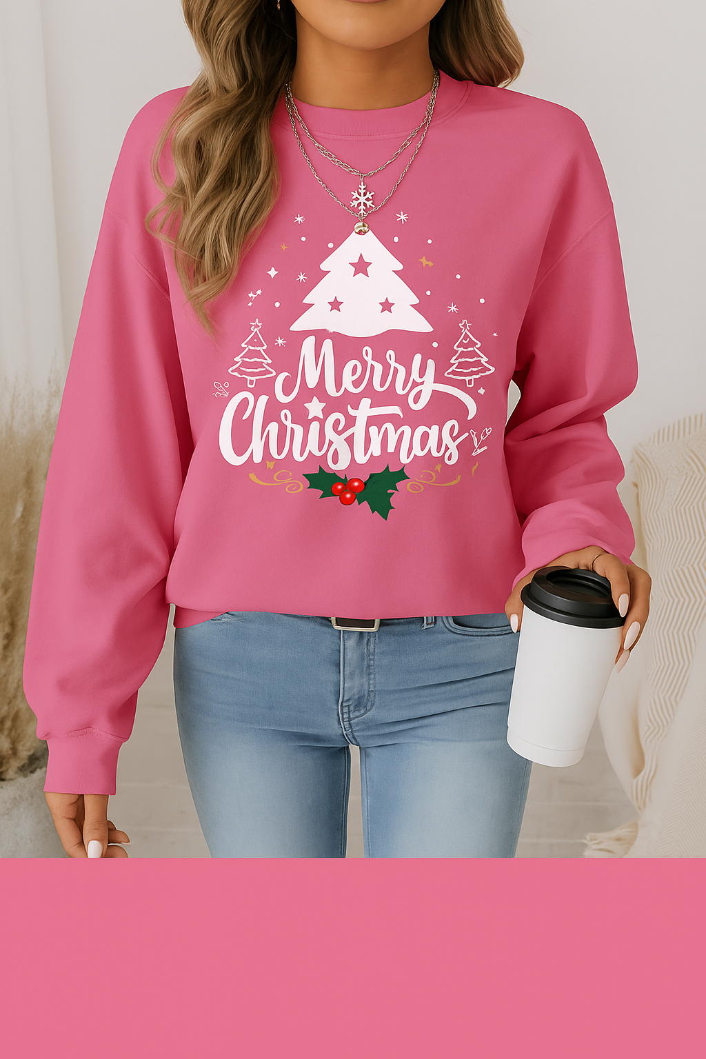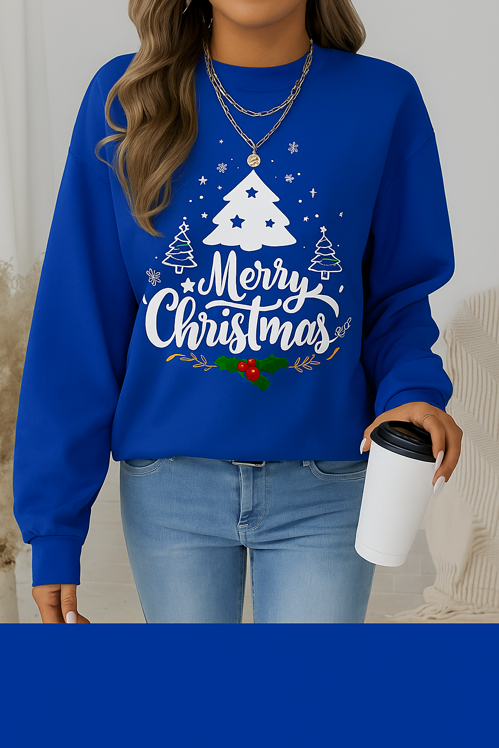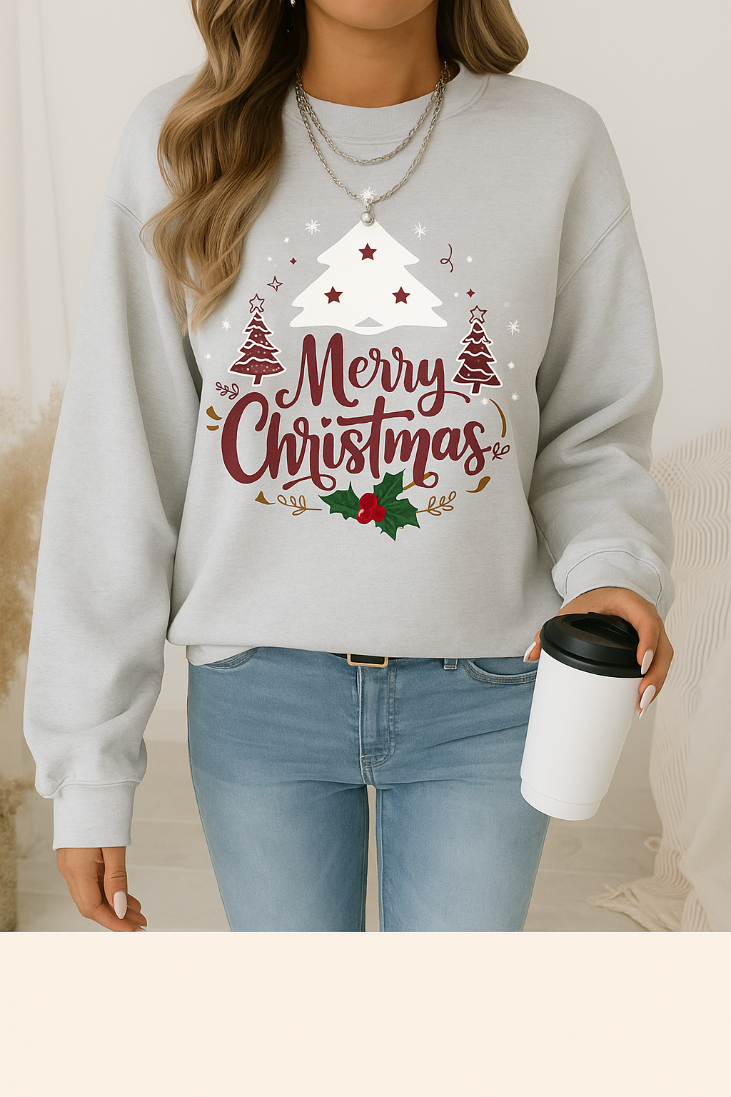 🎄 Festive Holiday Design: Stylish “Merry Christmas” print with a white tree, snowflakes, and holly details.