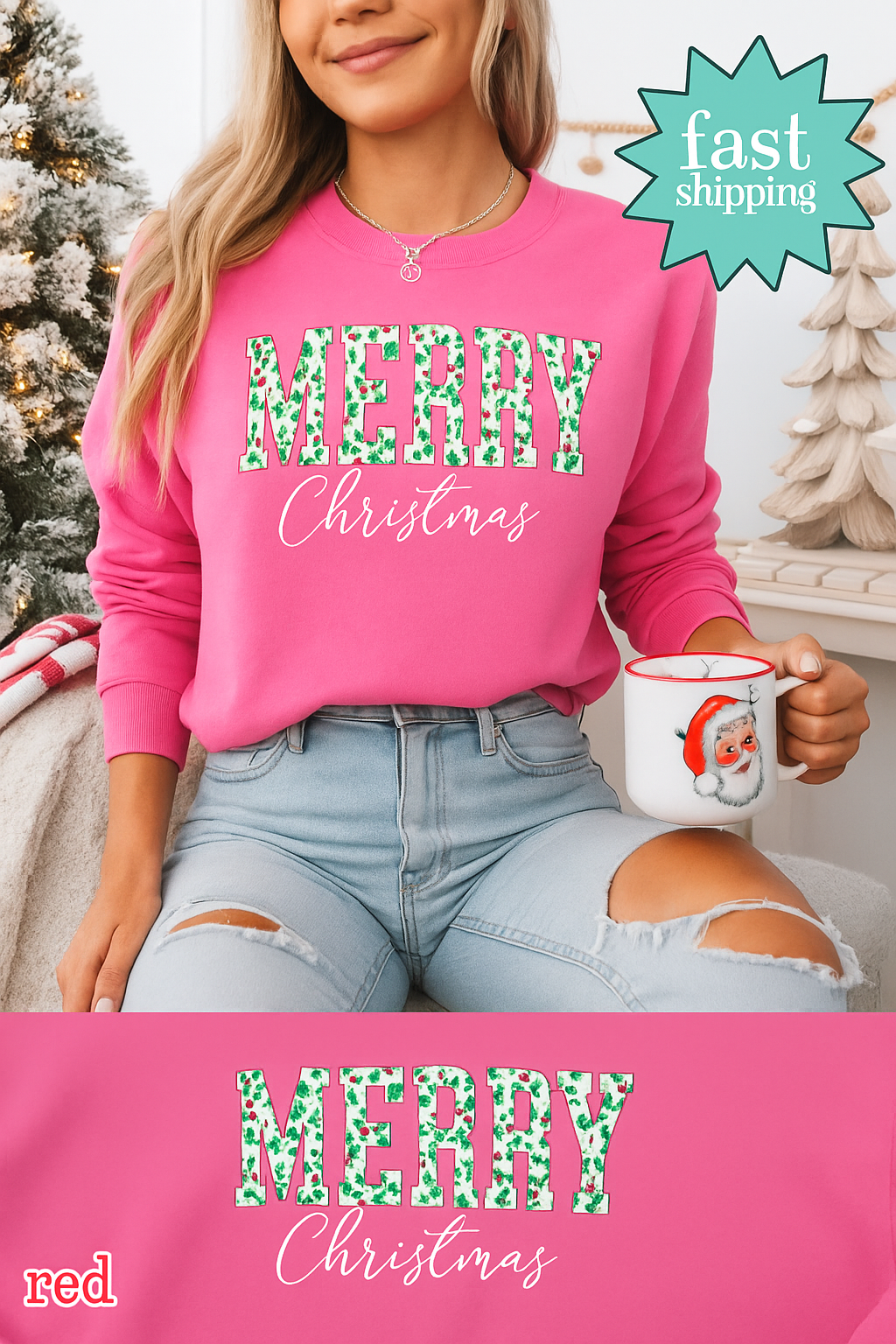 Celebrate the most wonderful time of the year in style with our Red Merry Christmas Sweatshirt! Featuring bold “MERRY Christmas” lettering in festive green and white holiday patterns, this sweatshirt perfectly captures the joyful Christmas spirit. Made from a soft and cozy cotton-polyester blend, it offers warmth and comfort for all your holiday activities — from decorating the tree to sipping hot cocoa by the fire. Its vibrant red color and stylish design make it a must-have for your winter wardrobe or the perfect Christmas gift for loved ones.