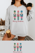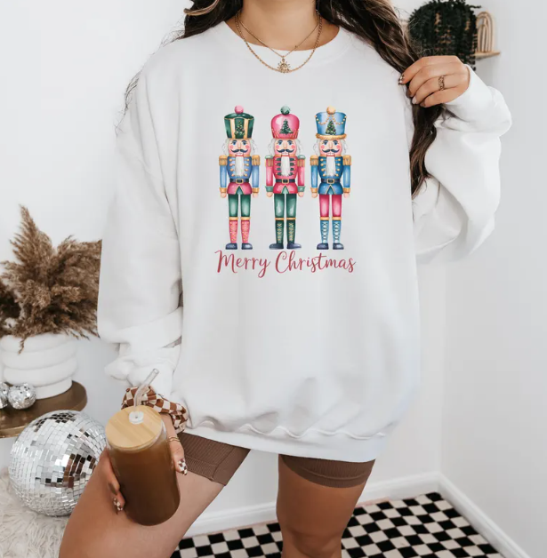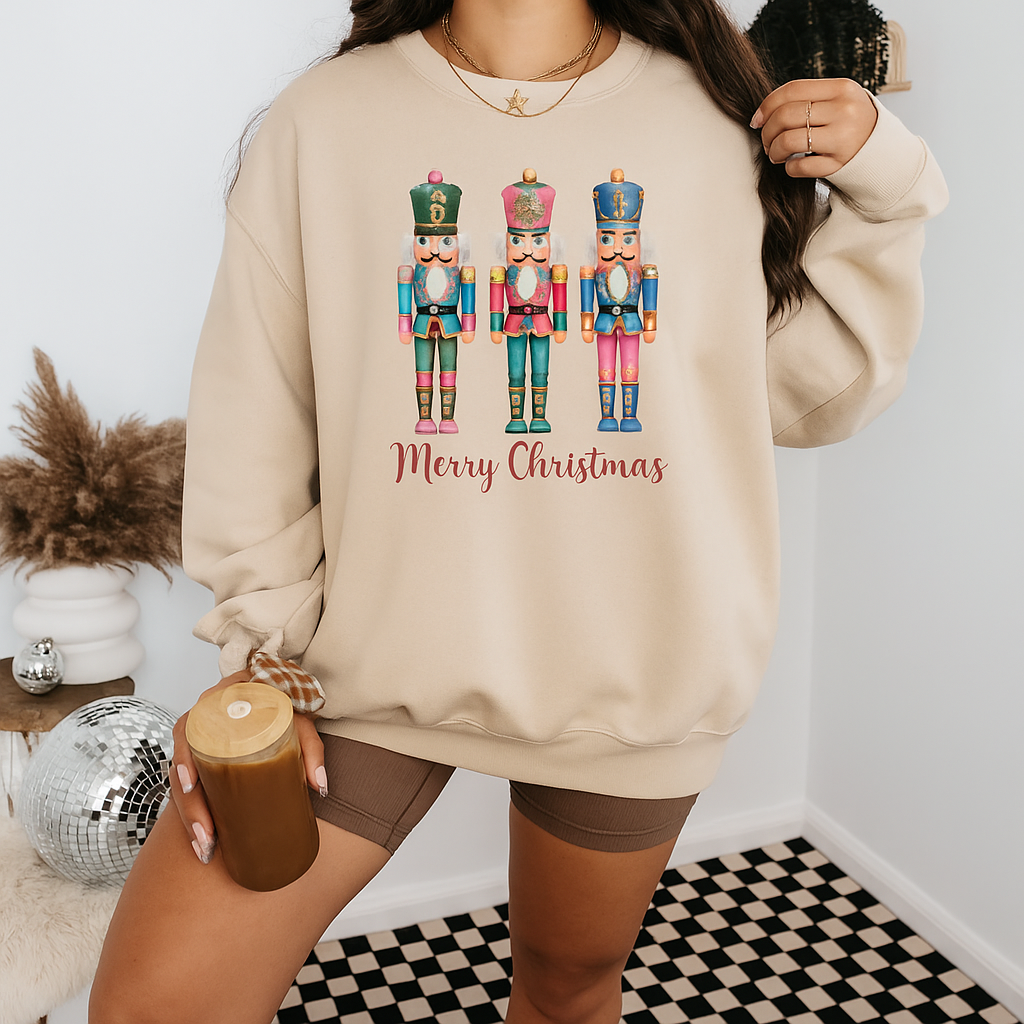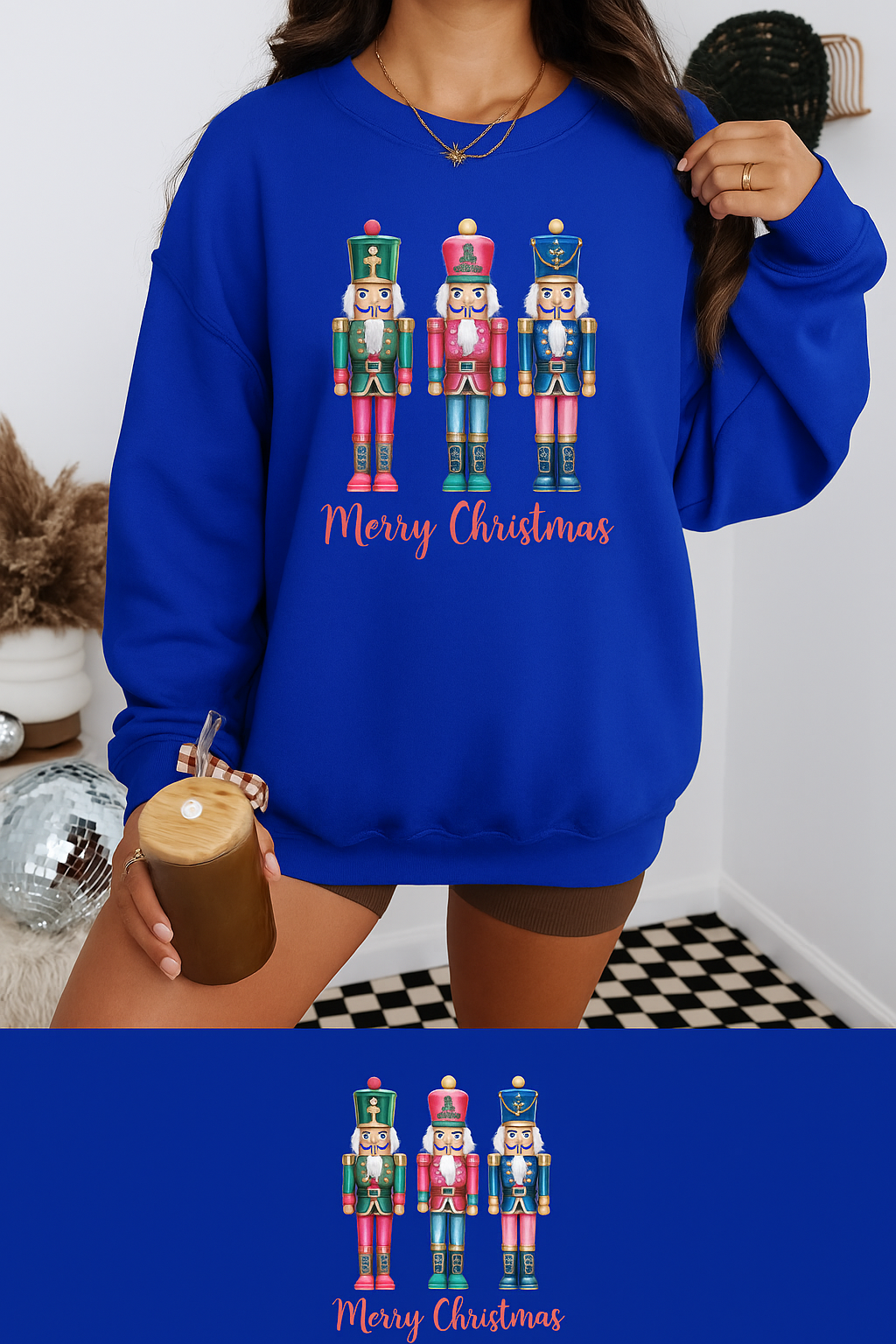 Celebrate the magic of the holidays with our Merry Christmas Nutcracker Sweatshirt! Featuring three colorful nutcracker soldiers and festive lettering, this sweatshirt brings classic Christmas charm to your winter wardrobe. Crafted from a soft cotton-polyester blend, it offers warmth, durability, and ultimate comfort — perfect for cozy nights, Christmas parties, or lounging by the fireplace. With its relaxed unisex fit and cheerful holiday design, this pullover is a must-have for spreading festive joy all season long.