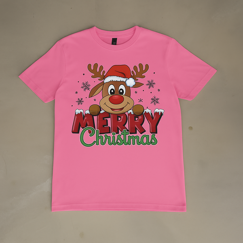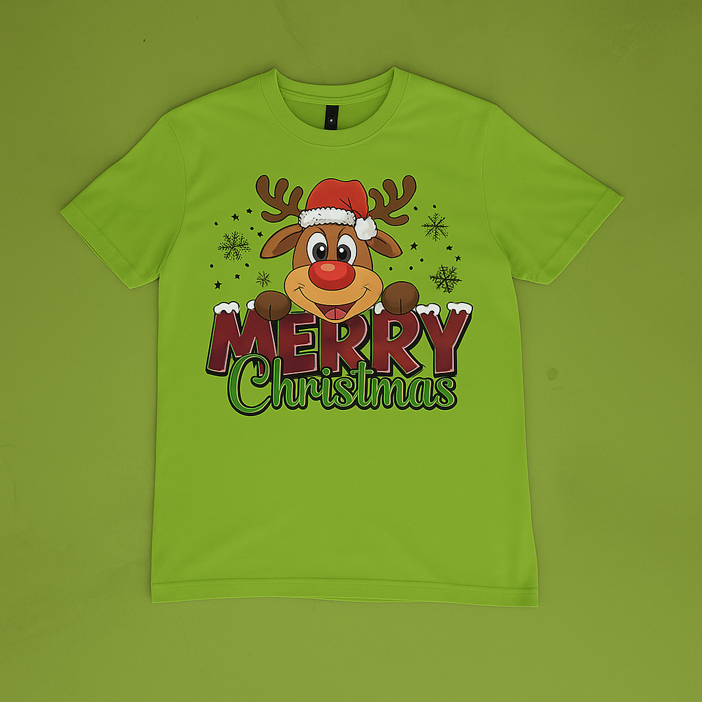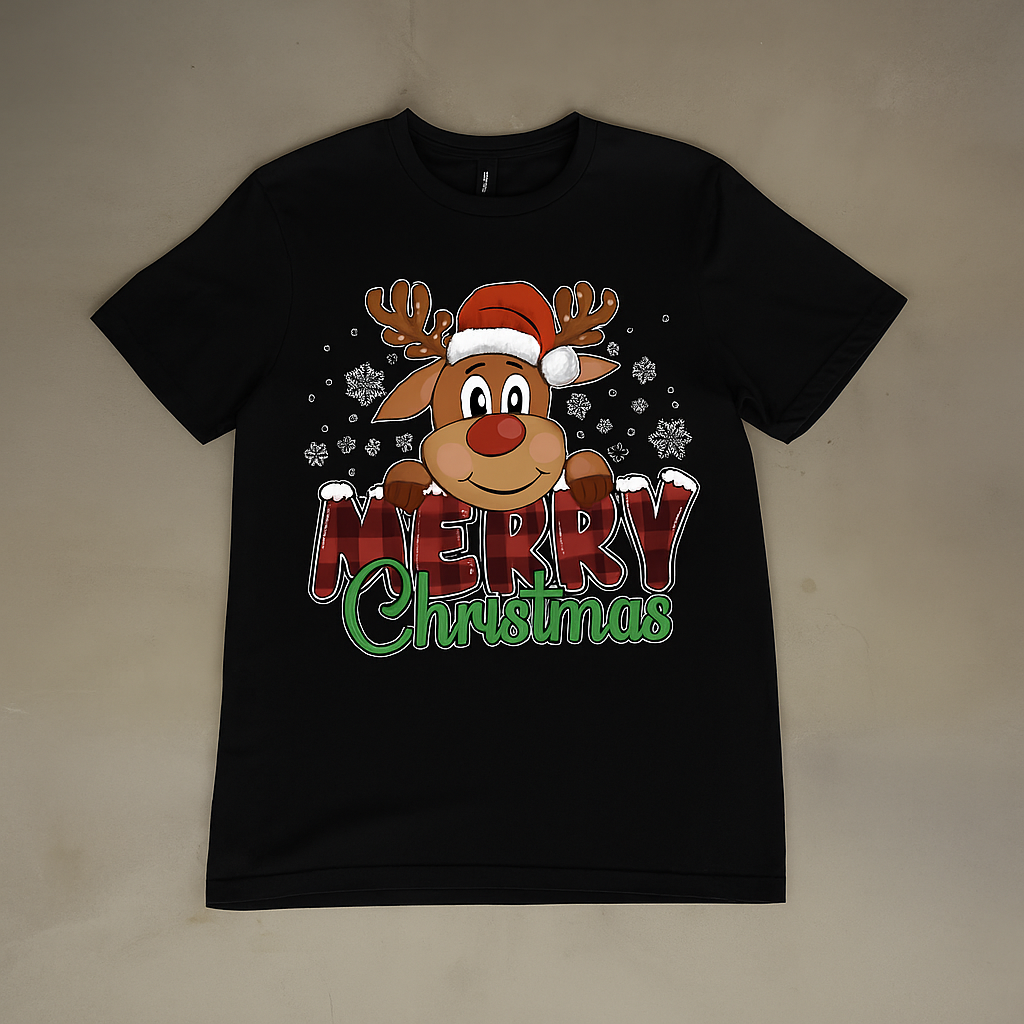 Bring joy and festive cheer to your holiday wardrobe with our Merry Christmas Reindeer T-Shirt! This adorable tee features a smiling reindeer in a Santa hat surrounded by snowflakes and a bold “Merry Christmas” print in classic red and green. Crafted from soft, breathable cotton, it’s perfect for keeping you comfortable during Christmas gatherings, family photos, or cozy days at home. The playful and cheerful design makes it ideal for adults and kids alike — spreading Christmas spirit wherever you go!