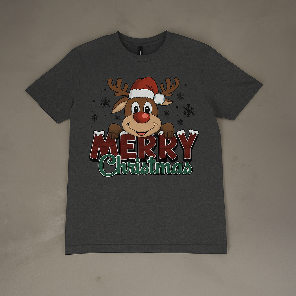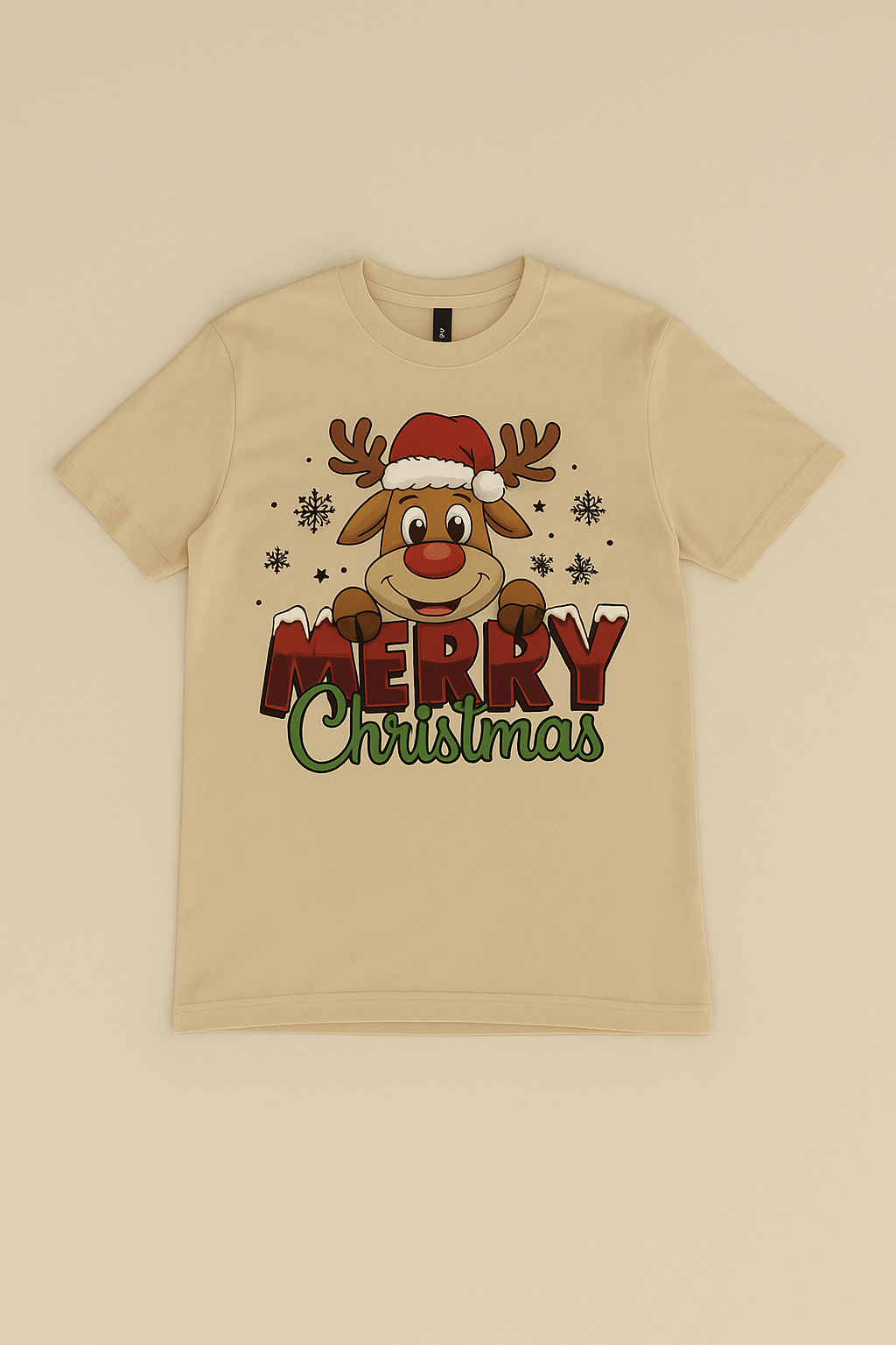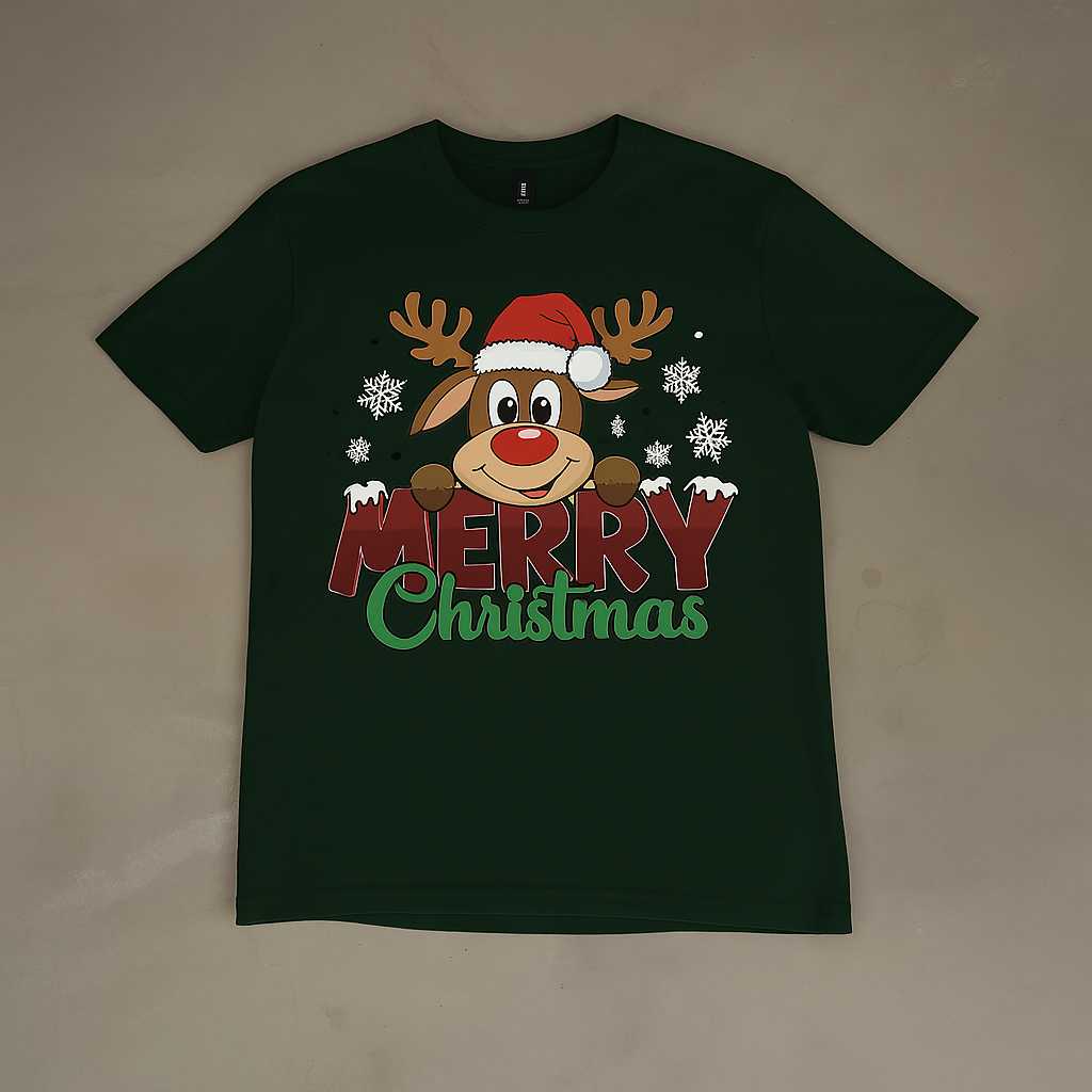 Bring joy and festive cheer to your holiday wardrobe with our Merry Christmas Reindeer T-Shirt! This adorable tee features a smiling reindeer in a Santa hat surrounded by snowflakes and a bold “Merry Christmas” print in classic red and green. Crafted from soft, breathable cotton, it’s perfect for keeping you comfortable during Christmas gatherings, family photos, or cozy days at home. The playful and cheerful design makes it ideal for adults and kids alike — spreading Christmas spirit wherever you go!