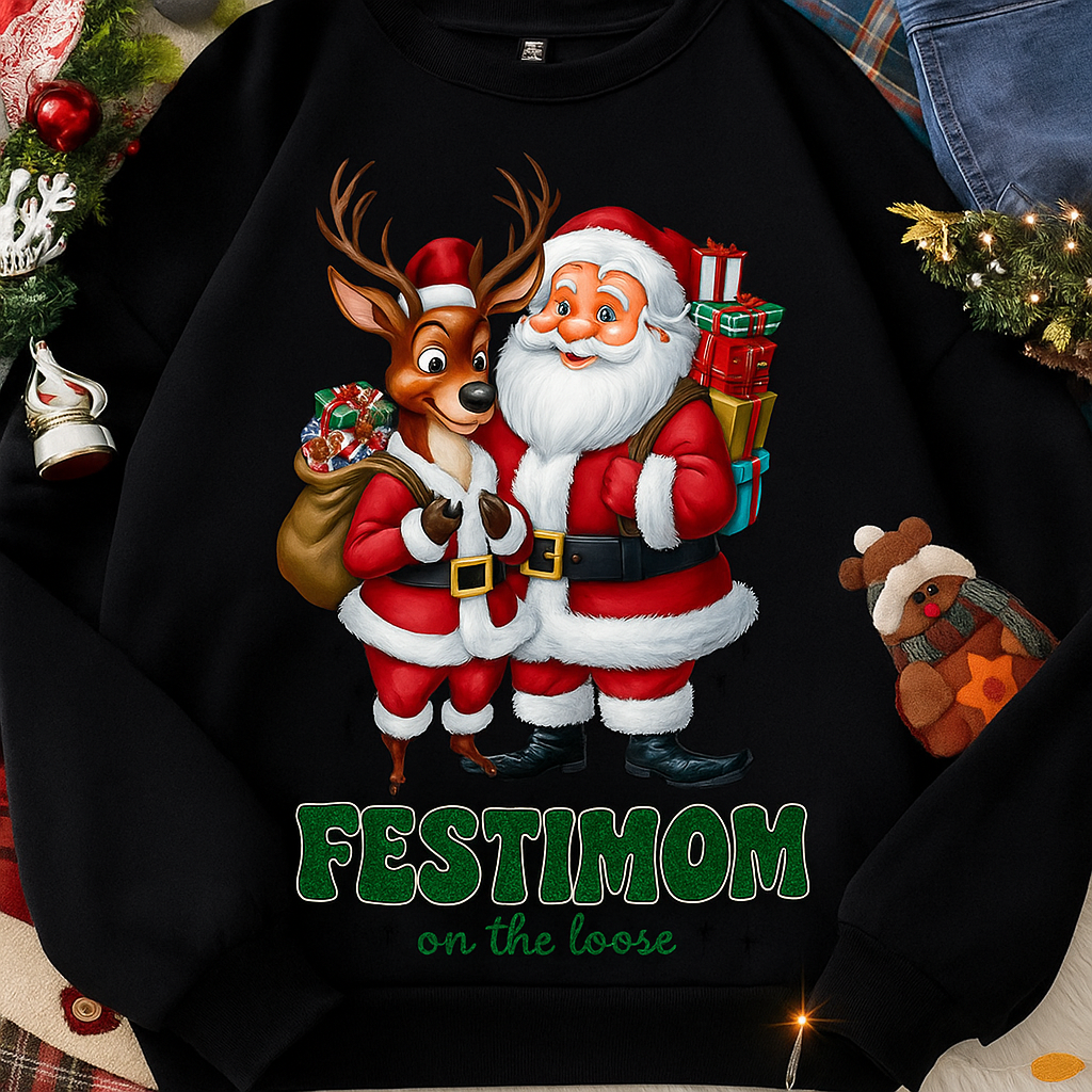 🎄 Charming Holiday Design: Adorable Santa and reindeer graphic surrounded by festive gifts and holiday cheer.