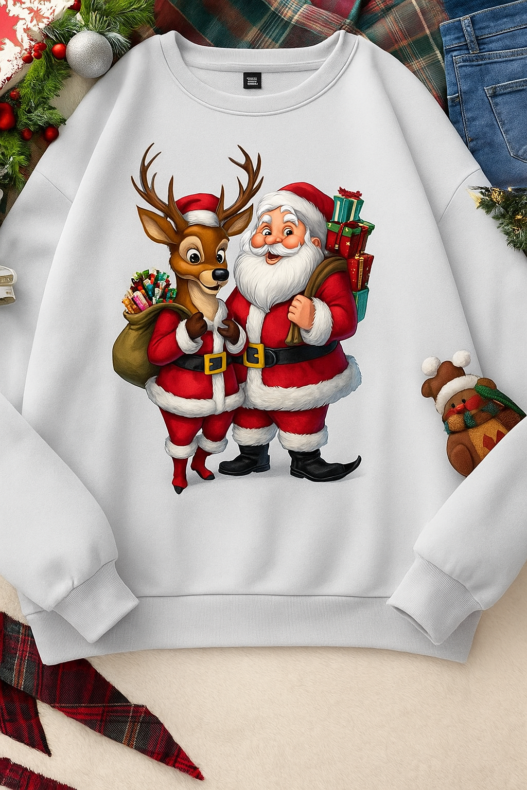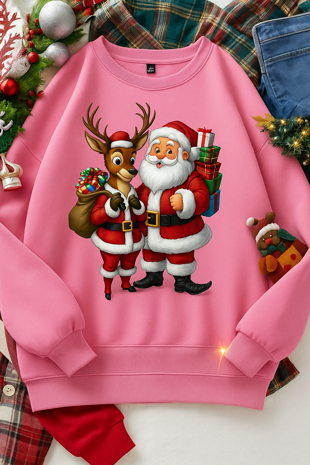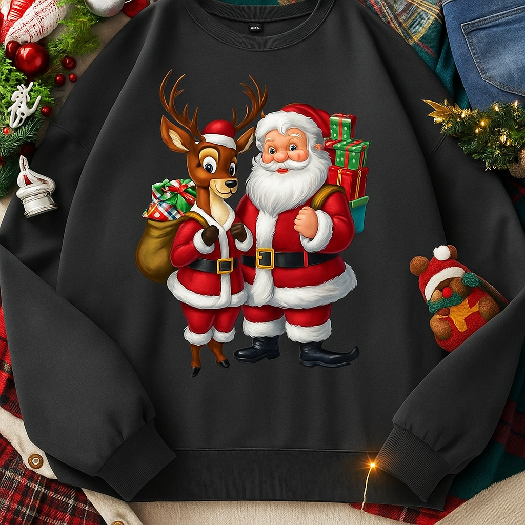 Celebrate the magic of Christmas with our Santa and Reindeer Christmas Sweatshirt! Featuring a heartwarming graphic of Santa Claus and his trusty reindeer dressed in matching red suits, this sweatshirt perfectly captures the cheerful holiday spirit. Crafted from a premium cotton-blend fabric, it offers exceptional softness, warmth, and comfort — ideal for chilly winter days, Christmas gatherings, or holiday movie nights. With its vibrant red color and festive print, it’s the ultimate cozy pullover for anyone who loves classic Christmas style.