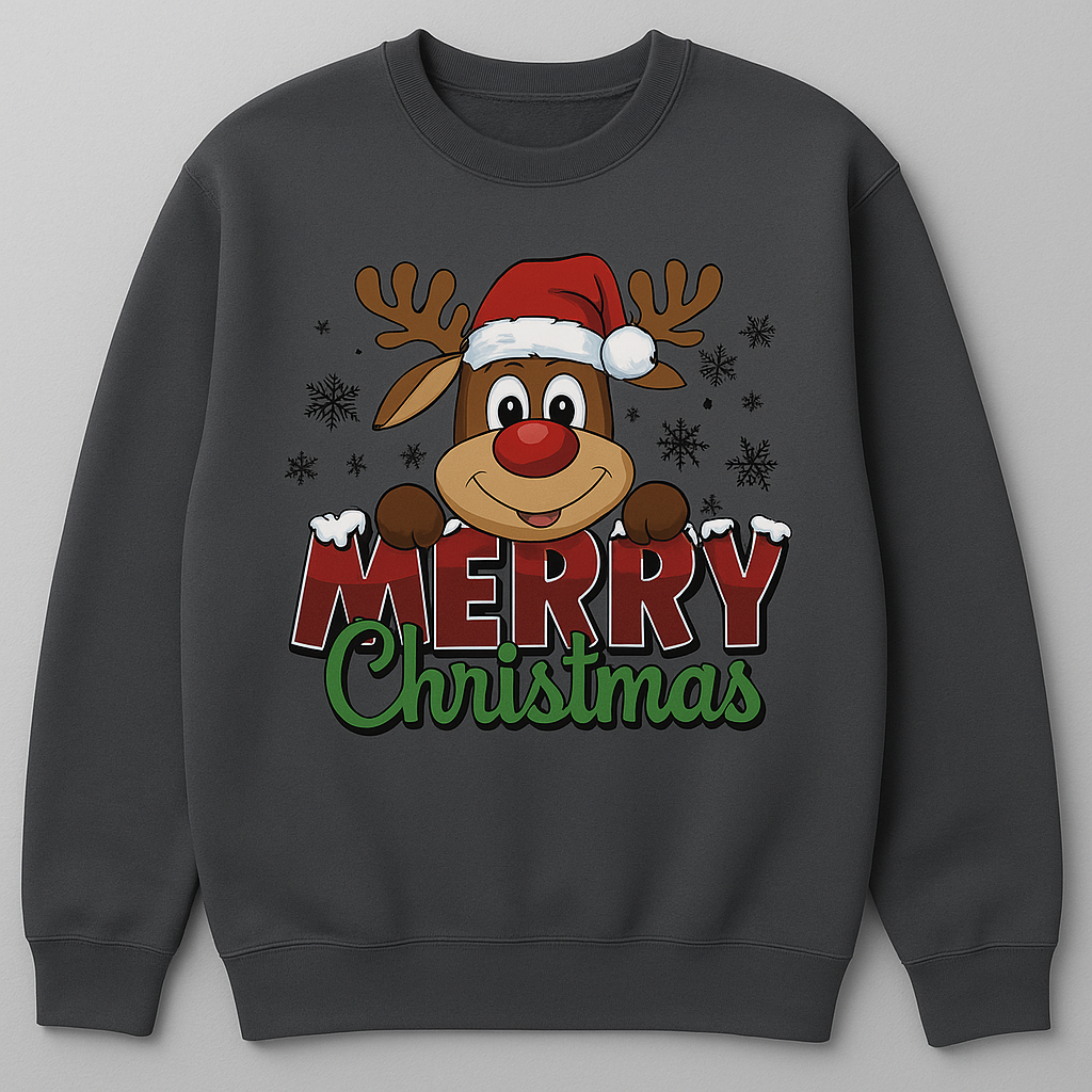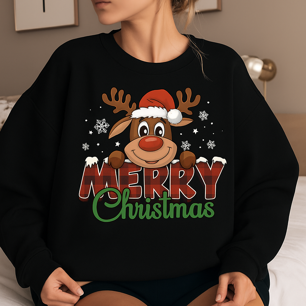 Spread the holiday cheer with our Merry Christmas Reindeer Sweatshirt! Featuring an adorable cartoon reindeer wearing a Santa hat surrounded by snowflakes and bold plaid “Merry Christmas” lettering, this sweatshirt perfectly captures the warmth and joy of the festive season. Crafted from a soft, premium cotton-blend fabric, it offers a cozy, relaxed fit — ideal for winter days, Christmas parties, or lounging at home. Its charming design makes it a perfect choice for both adults and teens who love fun and festive holiday fashion.