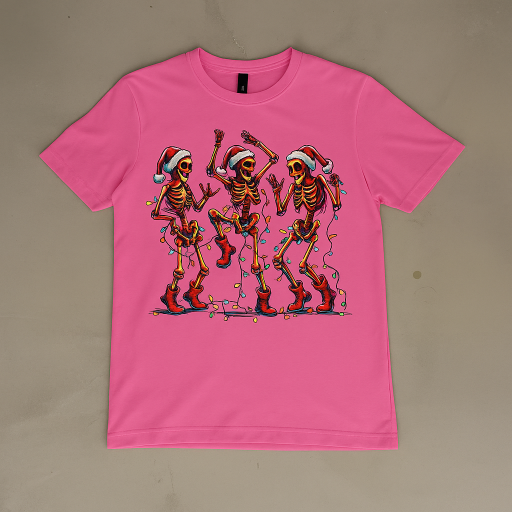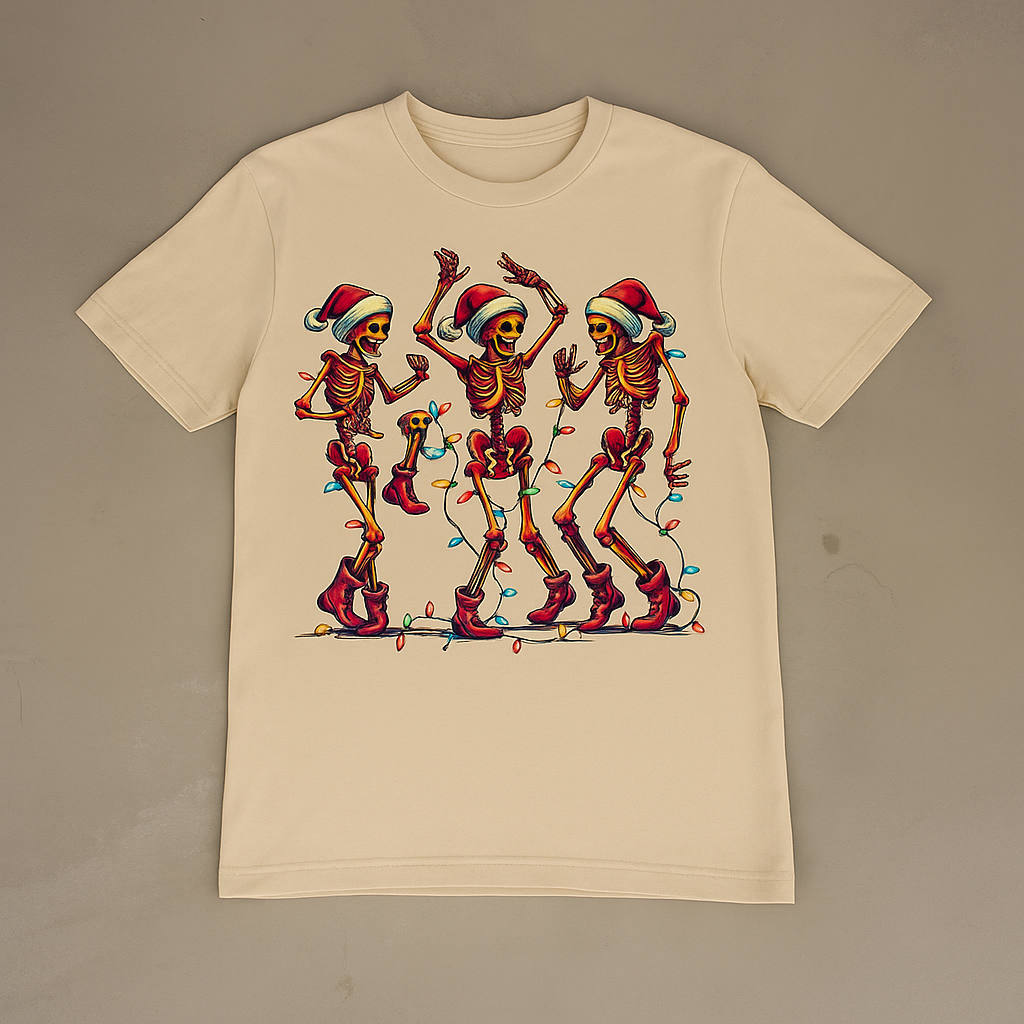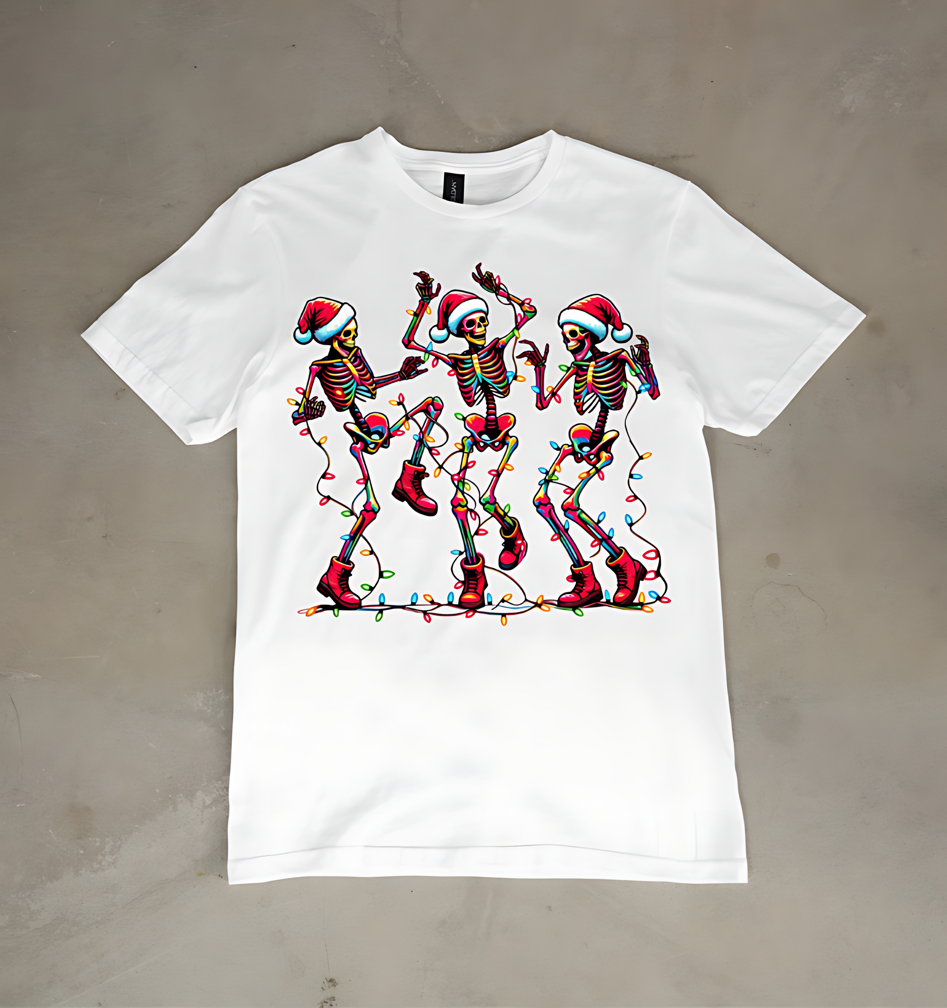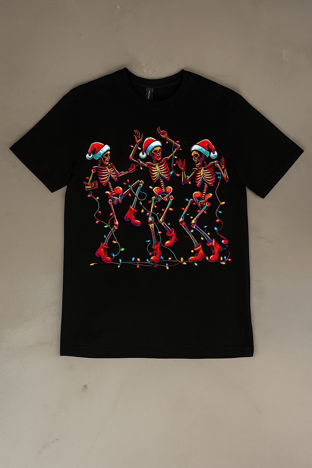 Get into the spooky holiday spirit with our Dancing Skeleton Christmas T-Shirt! Featuring three festive skeletons wearing Santa hats and tangled in colorful Christmas lights, this tee combines Halloween vibes with Christmas cheer. Perfect for those who love a humorous twist on the holidays, this shirt is a fun and comfy addition to your festive wardrobe. Whether you’re at a Christmas party or lounging at home, you’ll bring smiles and laughter everywhere you go!