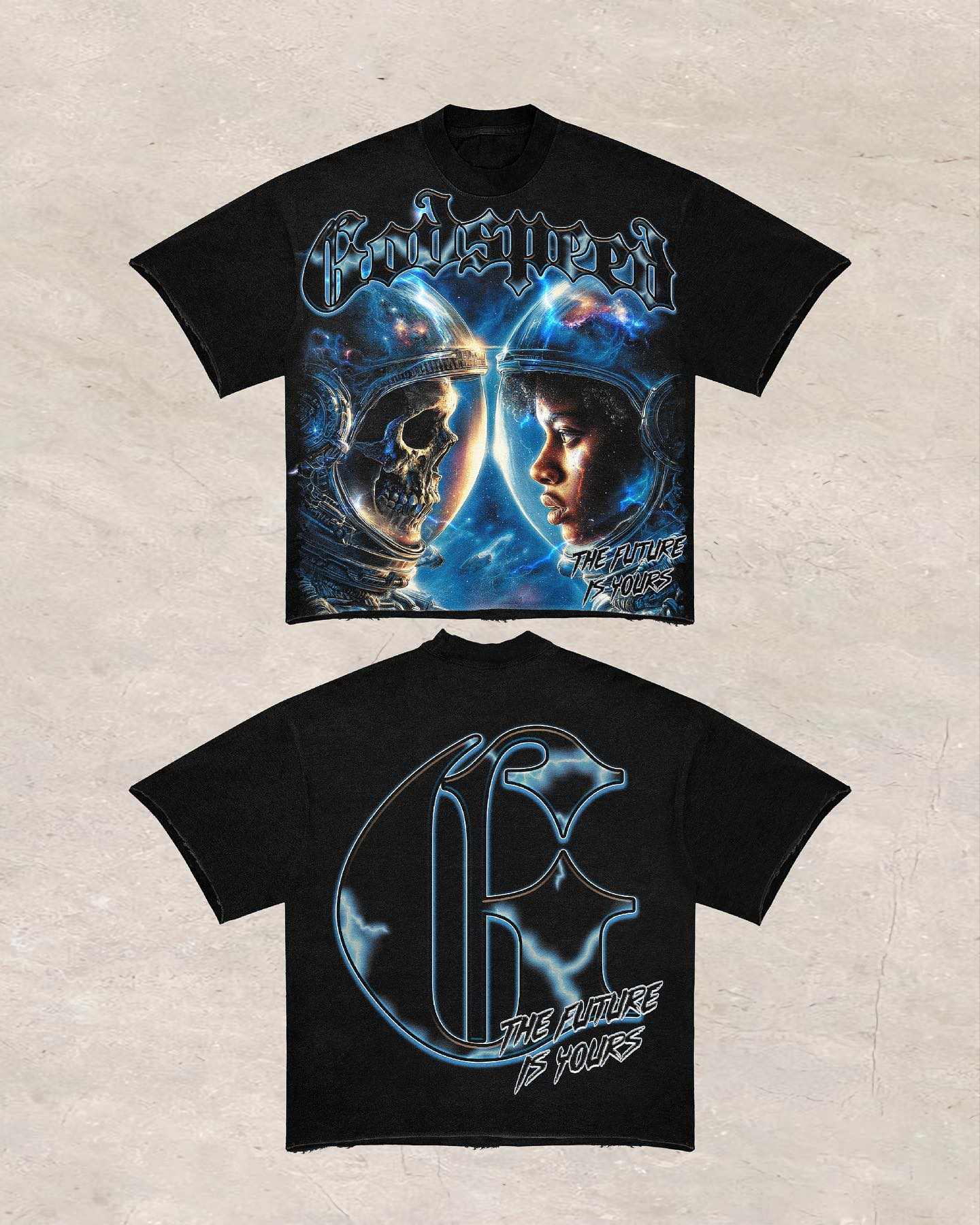 "“Godspeed: Final Transmission" is more than just a T-shirt – it’s a statement. Featuring a bold front graphic of a silenced child and a powerful slogan on the back, this design channels the fearless energy of Y2K and Harajuku streetwear.