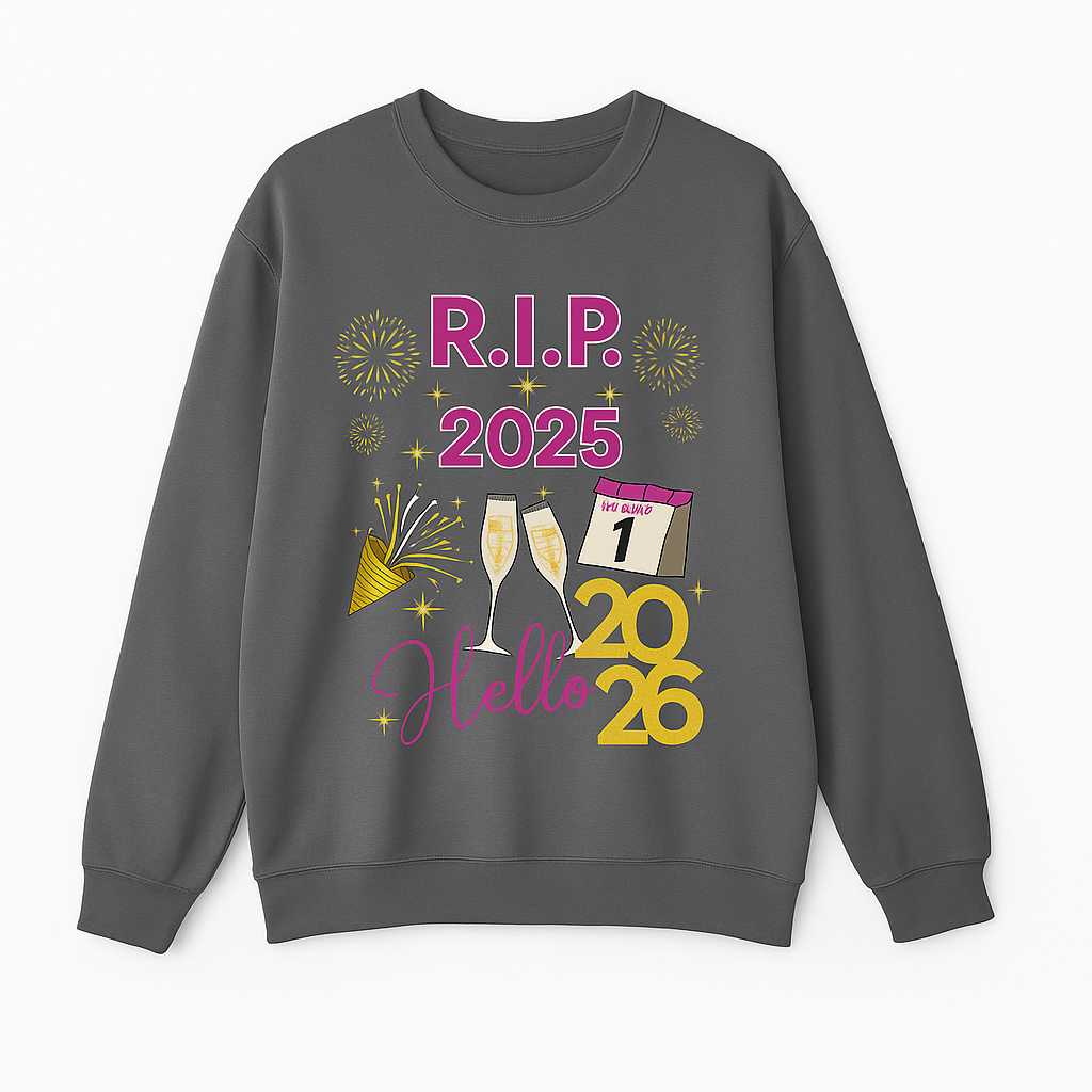 🎇 Fun New Year Design: “R.I.P 2025, Hello 2026” print with fireworks and champagne details for a festive vibe.