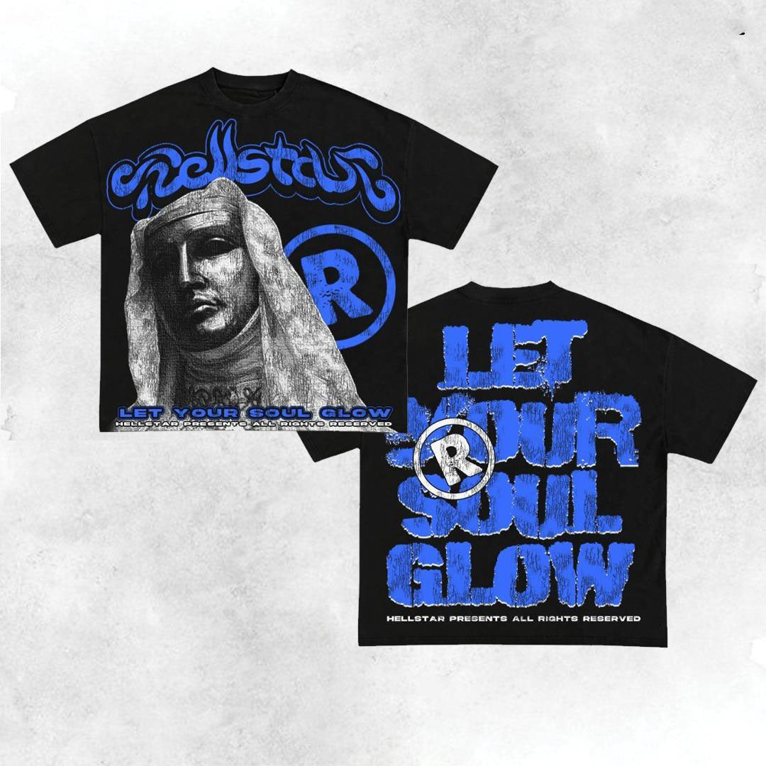 "Let Your Soul Glow"" is more than just a T-shirt – it’s a statement. Featuring a bold front graphic of a silenced child and a powerful slogan on the back, this design channels the fearless energy of Y2K and Harajuku streetwear.