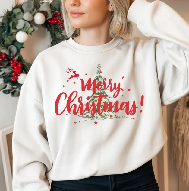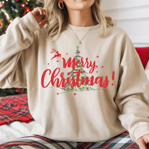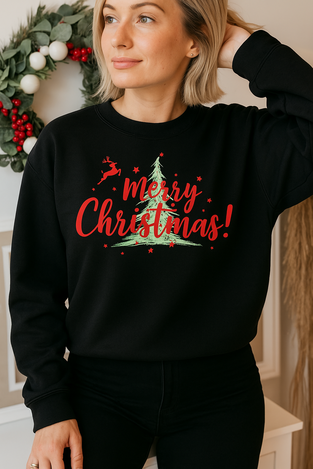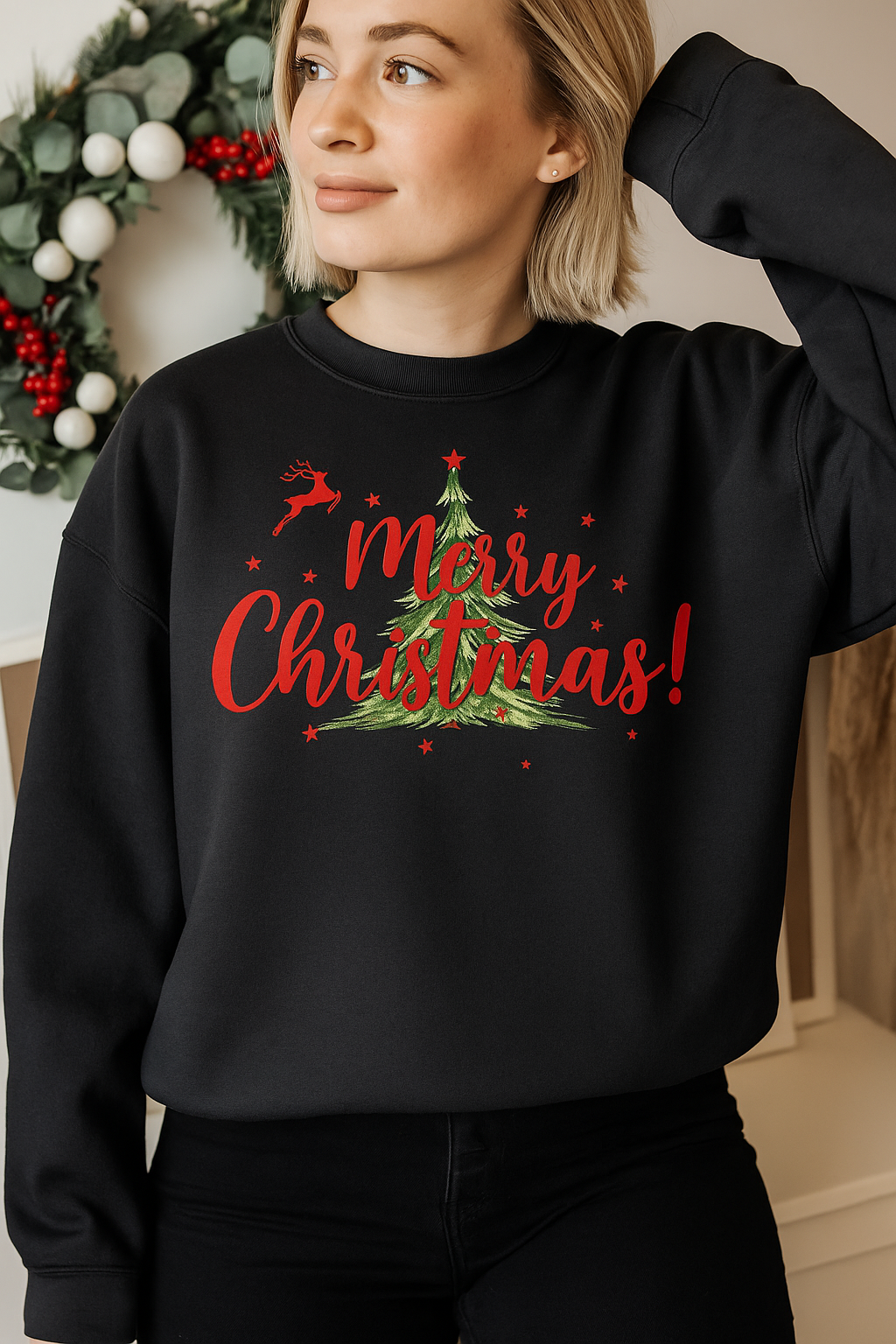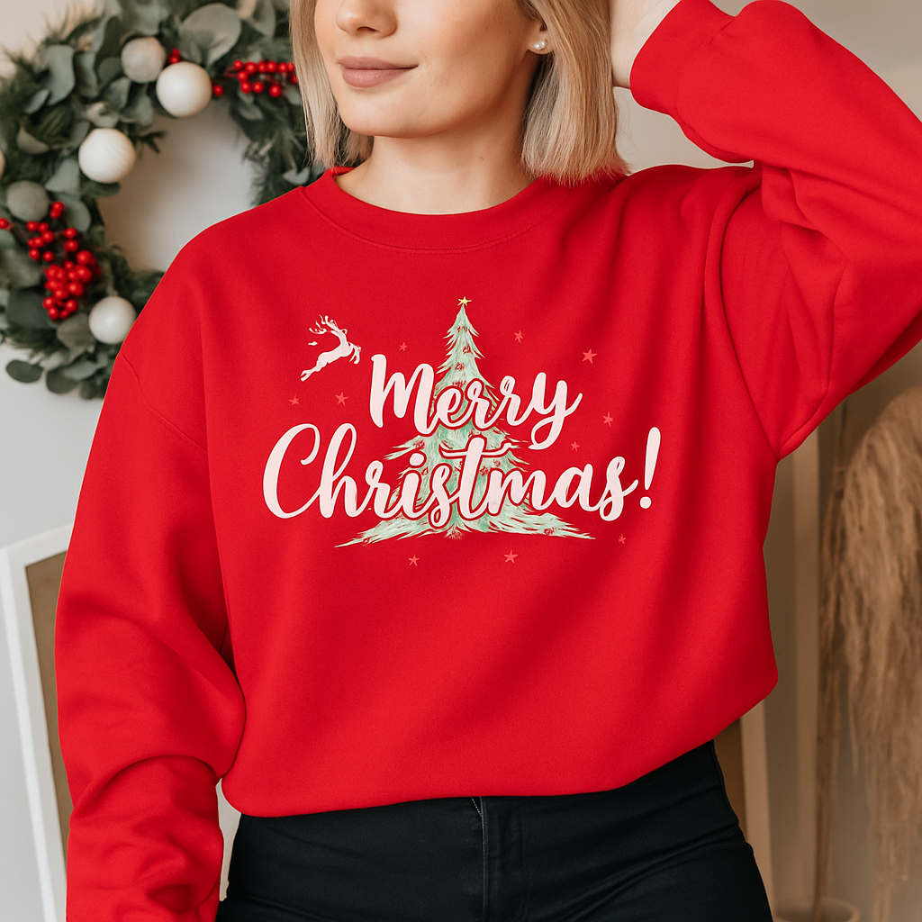 Spread the joy of the holiday season with our Merry Christmas Sweatshirt! Featuring a charming Christmas tree and reindeer design in vibrant red and green tones, this cozy pullover is perfect for celebrating the most wonderful time of the year. Made from a soft cotton-polyester blend, it offers warmth, comfort, and durability — ideal for chilly winter days, Christmas parties, or family gatherings. With its relaxed unisex fit, this sweatshirt brings both festive spirit and all-day coziness to your holiday wardrobe.