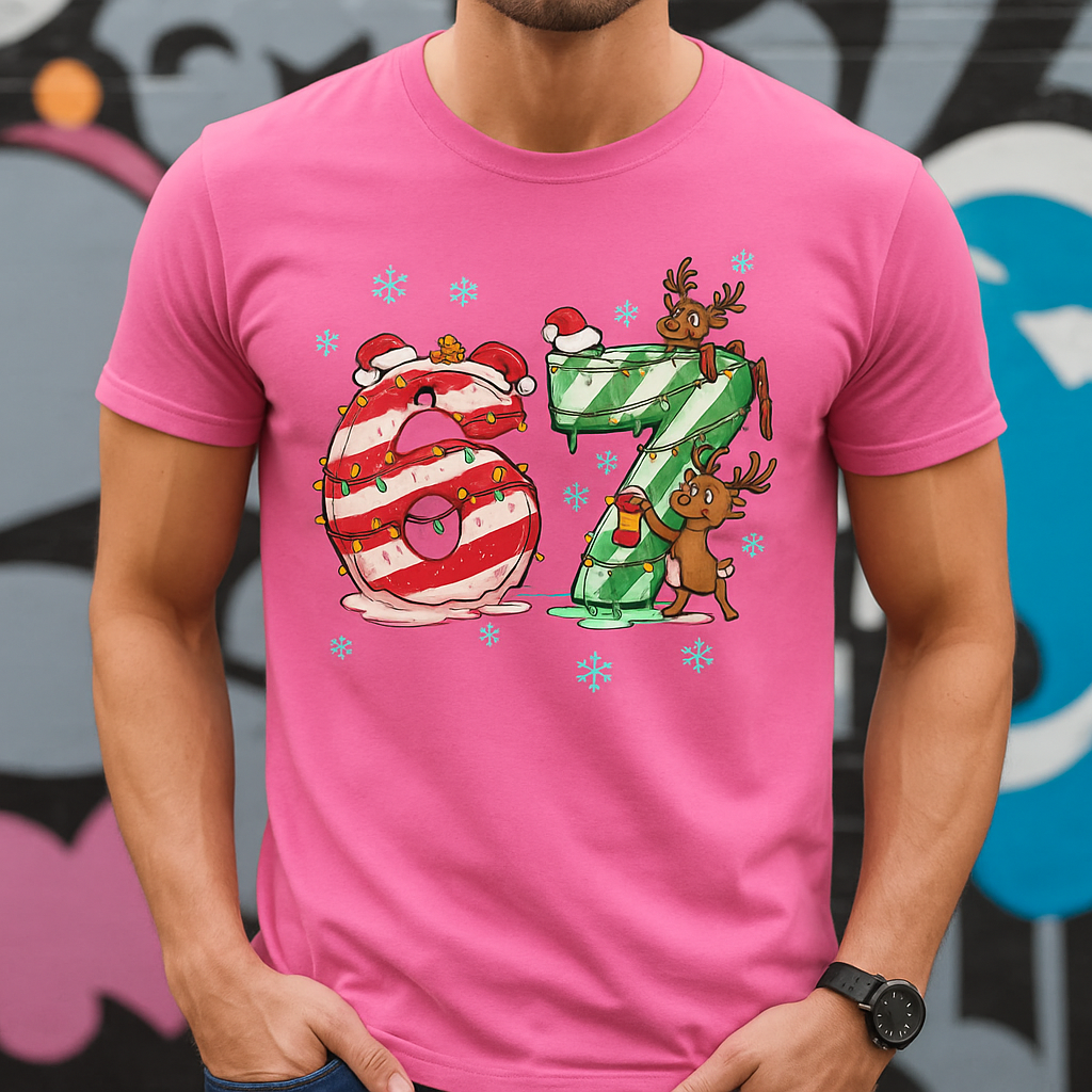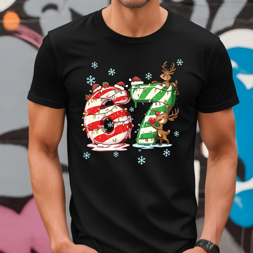 Celebrate the holiday season in style with our 67 Christmas Reindeer T-Shirt! This playful Christmas tee features the number “67” designed in candy cane stripes, surrounded by cheerful reindeer, Santa hats, and twinkling holiday lights. It’s the perfect shirt for anyone born in 1967 or celebrating a special milestone this Christmas. Crafted from soft, breathable cotton, this festive shirt offers comfort and durability — ideal for family gatherings, Christmas parties, or everyday wear during the holidays.