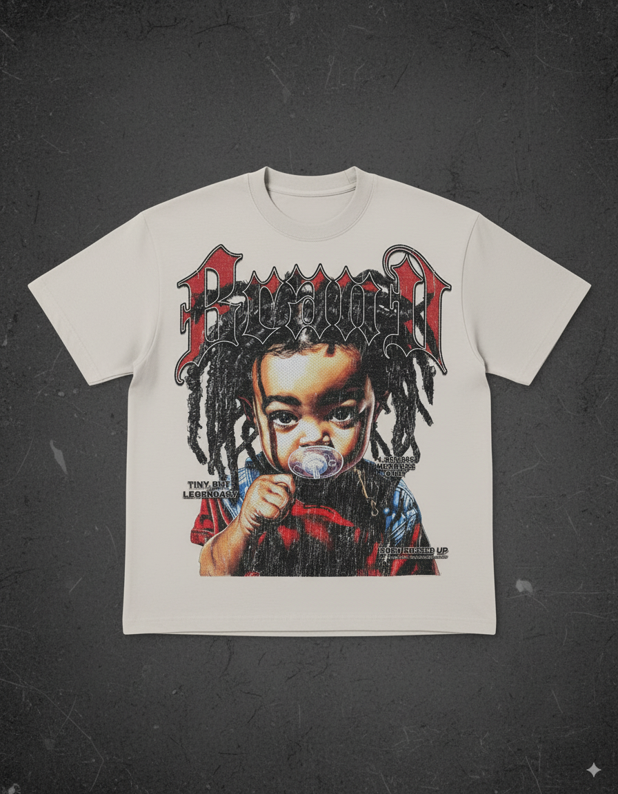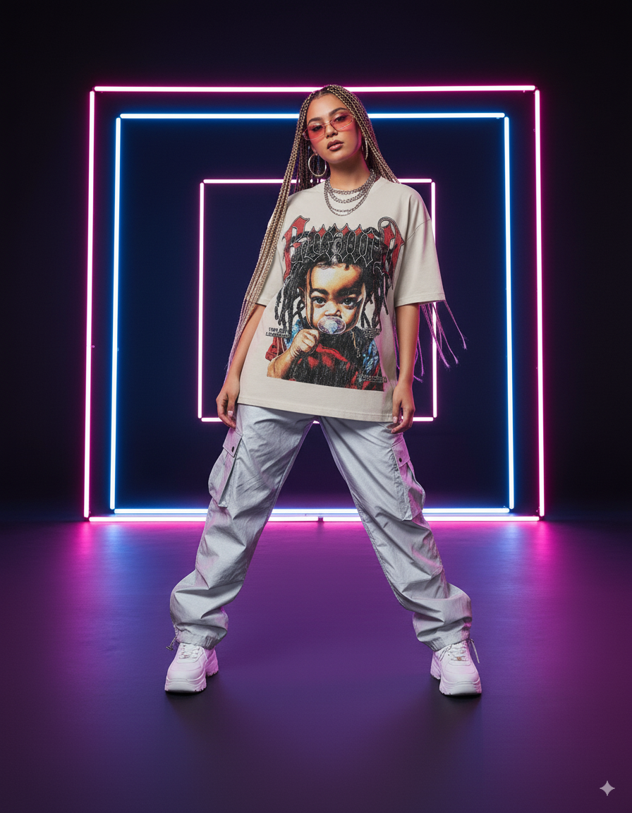 "Baby Ghetto Star Tee" is more than just a T-shirt – it’s a statement. Featuring a bold front graphic of a silenced child and a powerful slogan on the back, this design channels the fearless energy of Y2K and Harajuku streetwear.