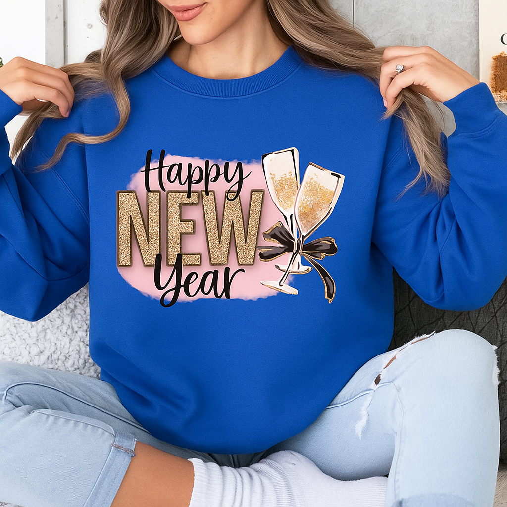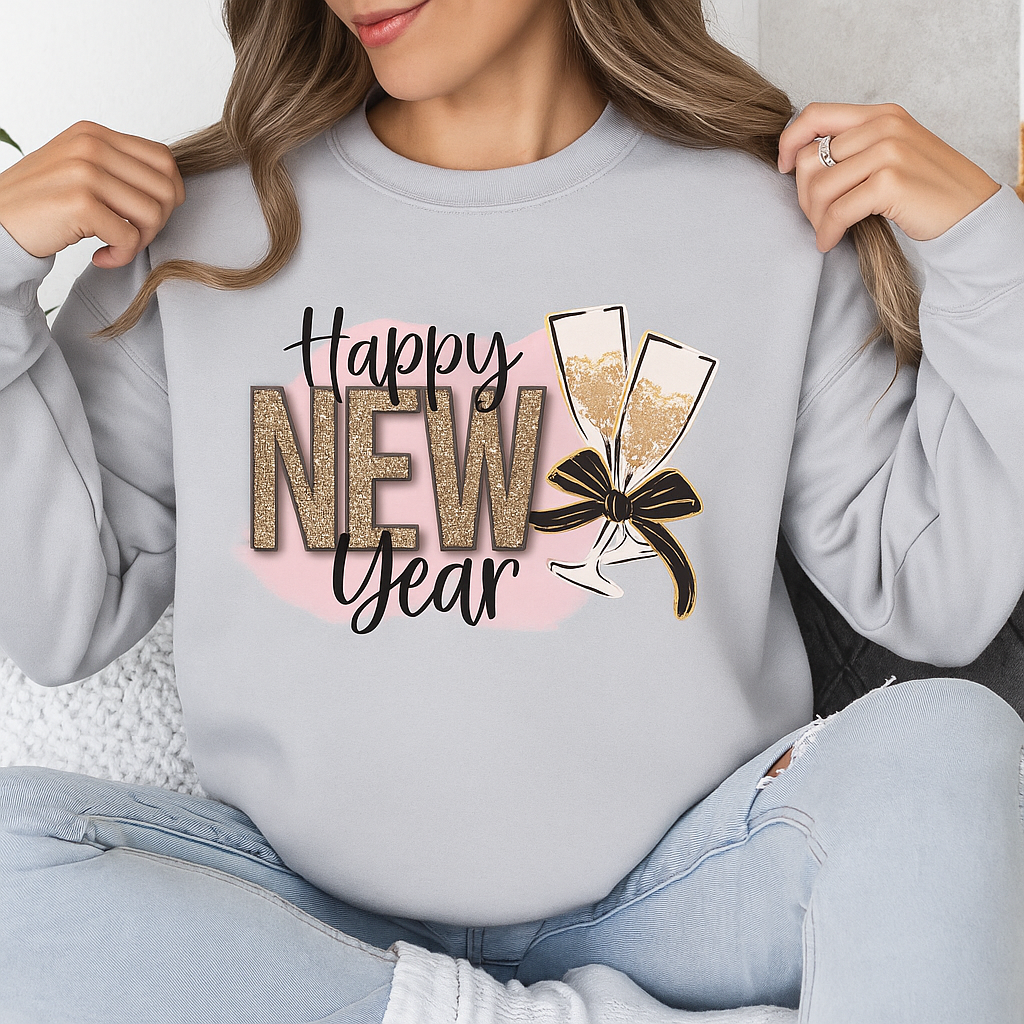 Ring in the New Year with sparkle and style in our Happy New Year Glitter Champagne Sweatshirt! Featuring elegant golden glitter “NEW YEAR” lettering with champagne glasses and a chic black bow, this sweatshirt perfectly captures the festive and glamorous spirit of the season. Crafted from a soft cotton-polyester blend, it offers the ideal balance of comfort and warmth — perfect for celebrating New Year’s Eve, winter parties, or cozying up at home with loved ones. Add a touch of glam to your holiday wardrobe and make every toast shine!